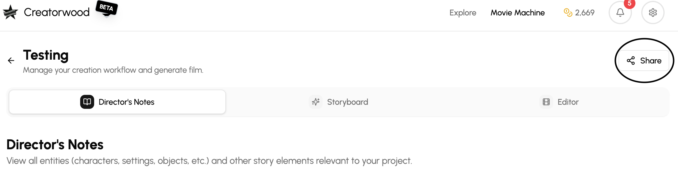 Step 1: Click Movie Machine at the top of the page and select the project you’d like to share.