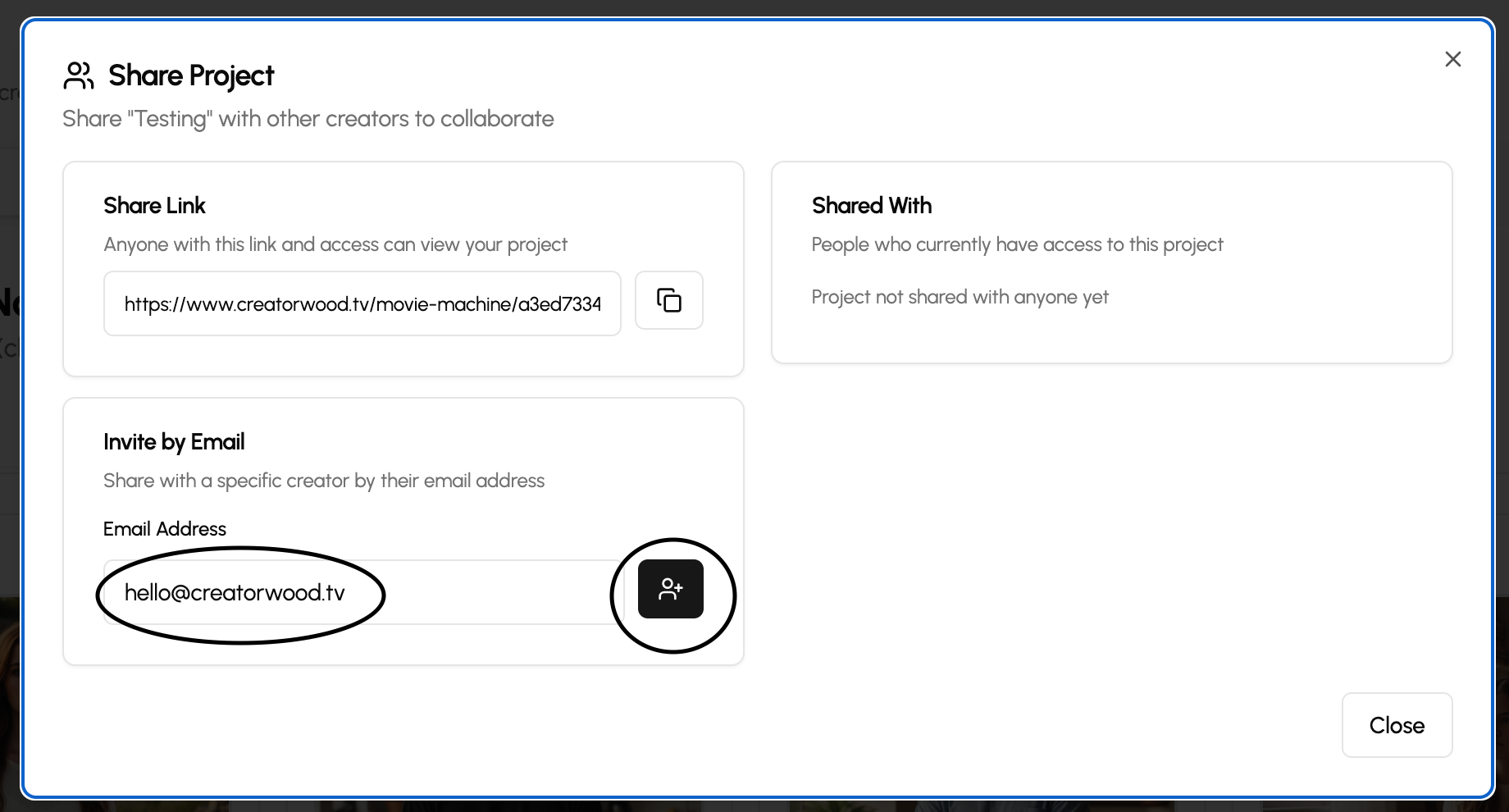Step 3: A box will appear. Under Invite by Email, enter the creator’s email address that’s linked to their Creatorwood account, then click the icon beside it.