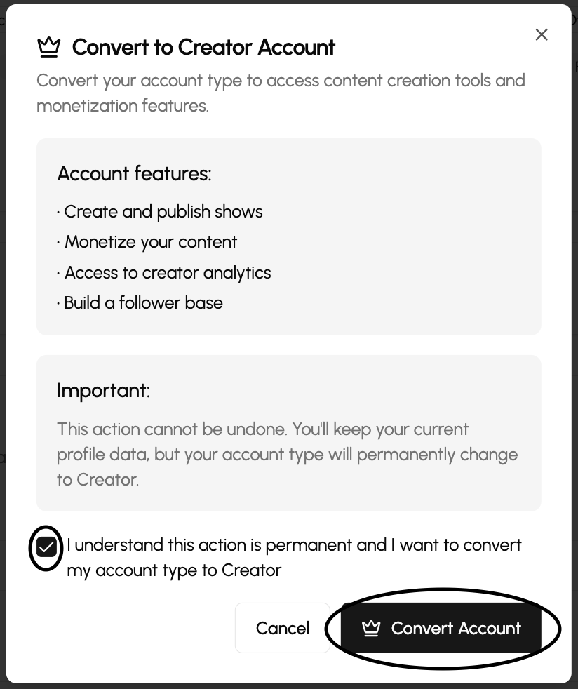 ⚠️ Please note: Converting an account to Creator is permanent and cannot be undone.