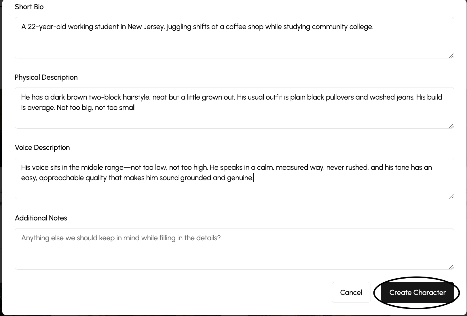 - After filling in the description and adding any extra notes, scroll down and click Create Character.