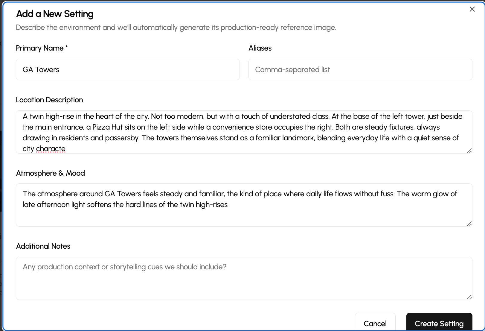 - It’s recommended to also include the style under Additional Notes (e.g., “Comic-style animation”) so your new setting matches the style of your other settings.
