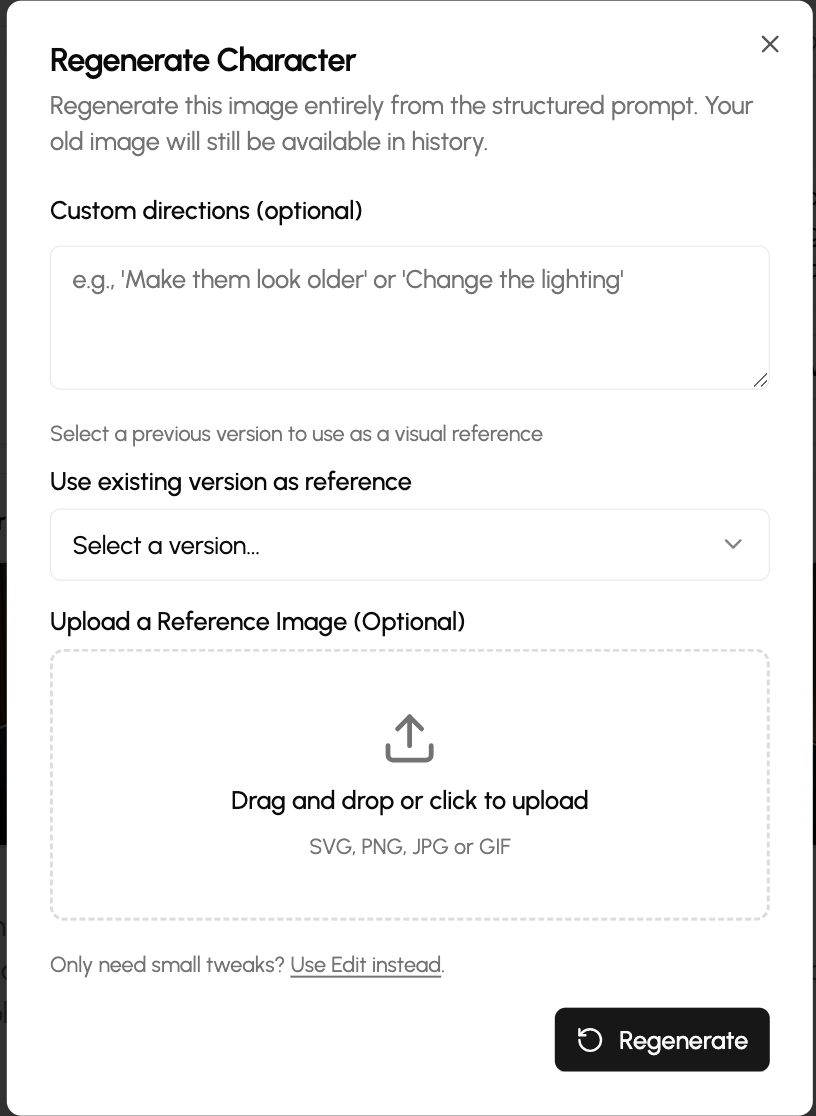 - Selecting Regenerate will completely change your character’s image based on its structured prompt — essentially a full redesign.
