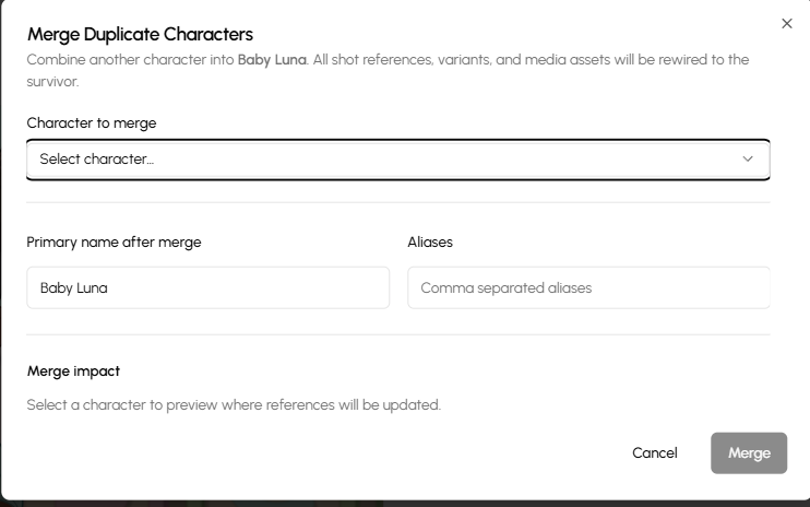 - You can edit the character’s name, aliases, and add any merge notes as needed.