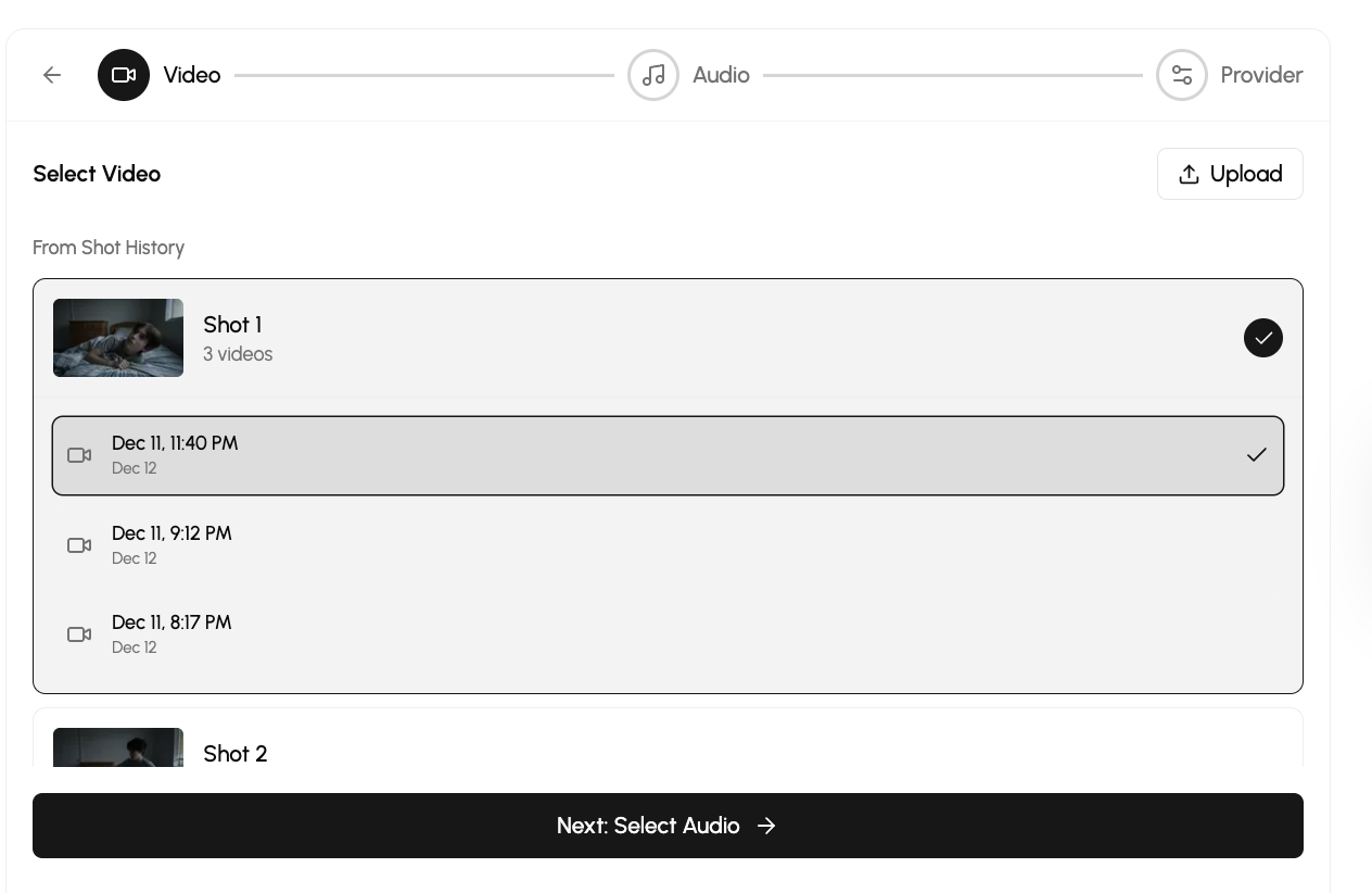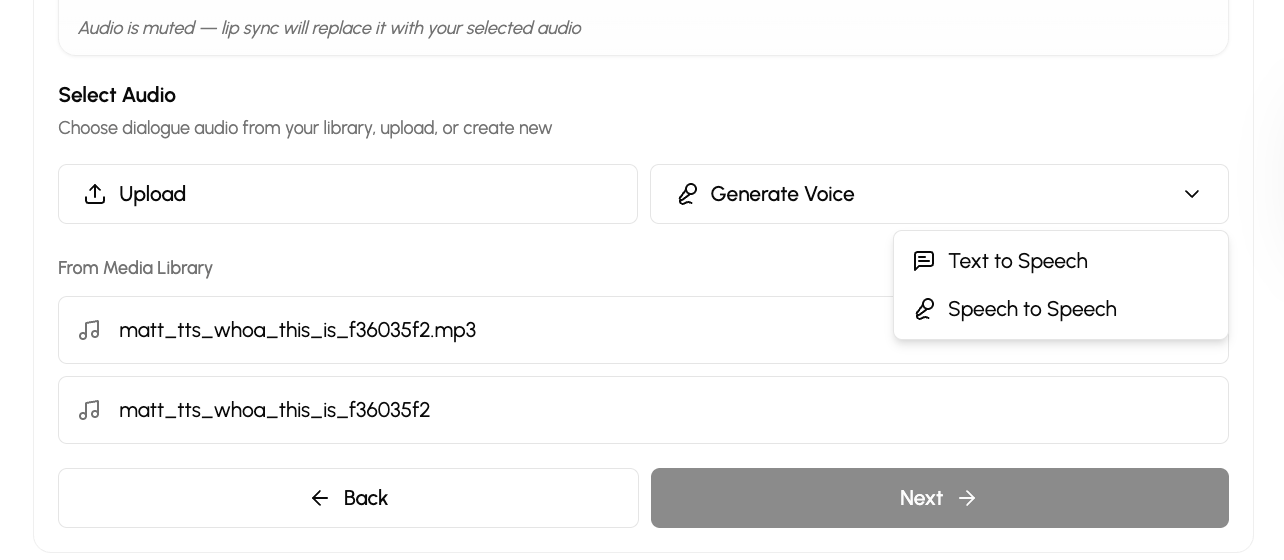 Choose dialogue audio from your library, upload, or Generate Voice (Text to Speech or Speech to Speech).