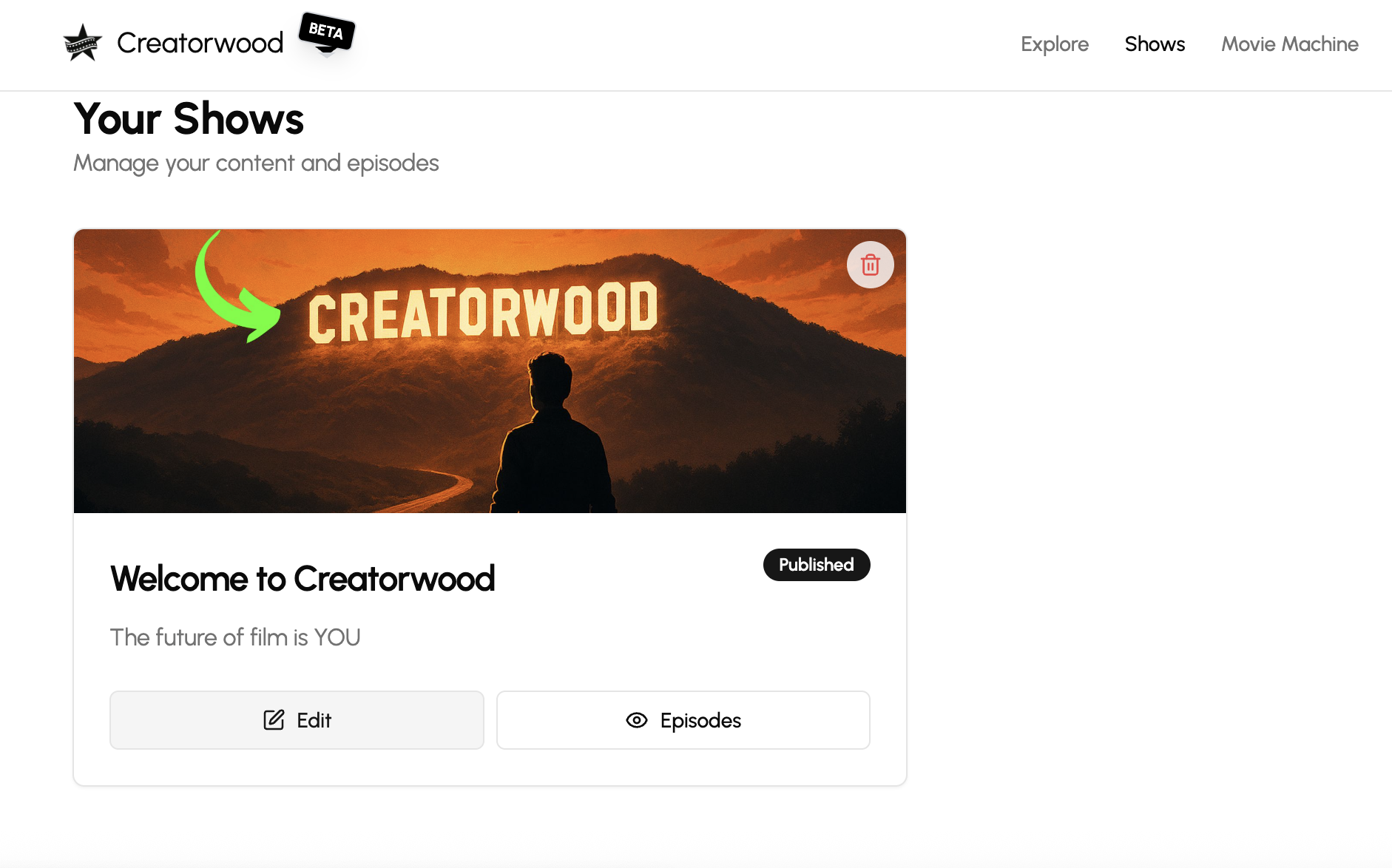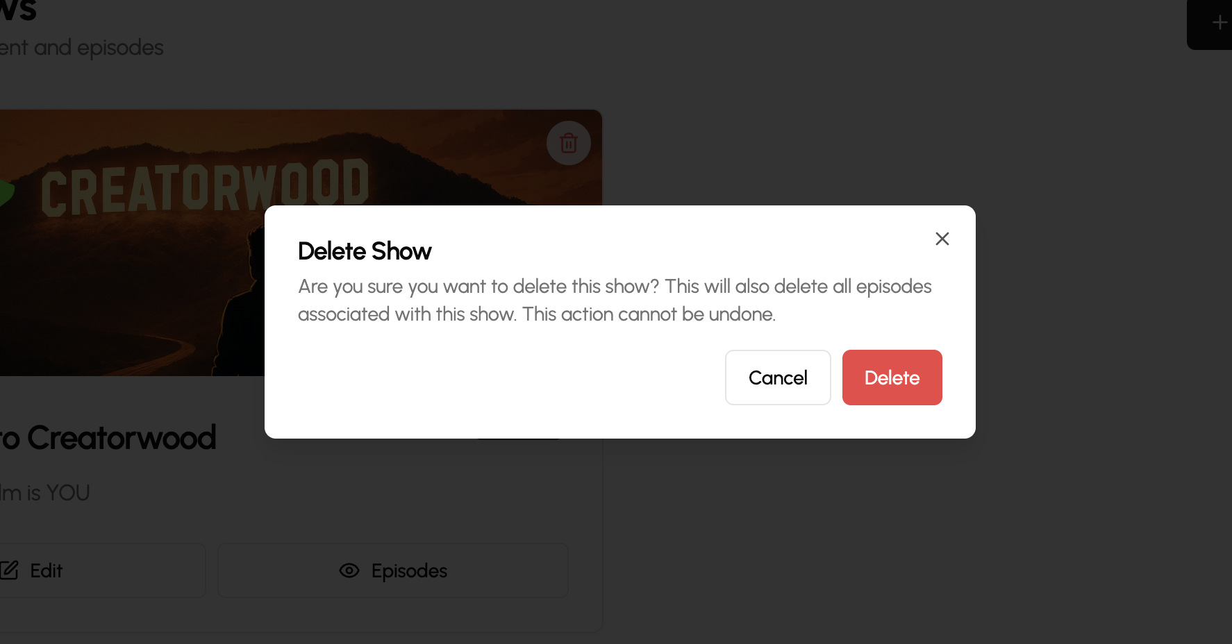 How to Delete Shows To delete a movie or show in Creatorwood: Go to the “Shows” tab. Hover over the thumbnail of the show you want to delete. Click the trash icon. A confirmation message will appear—click “Delete” to confirm.